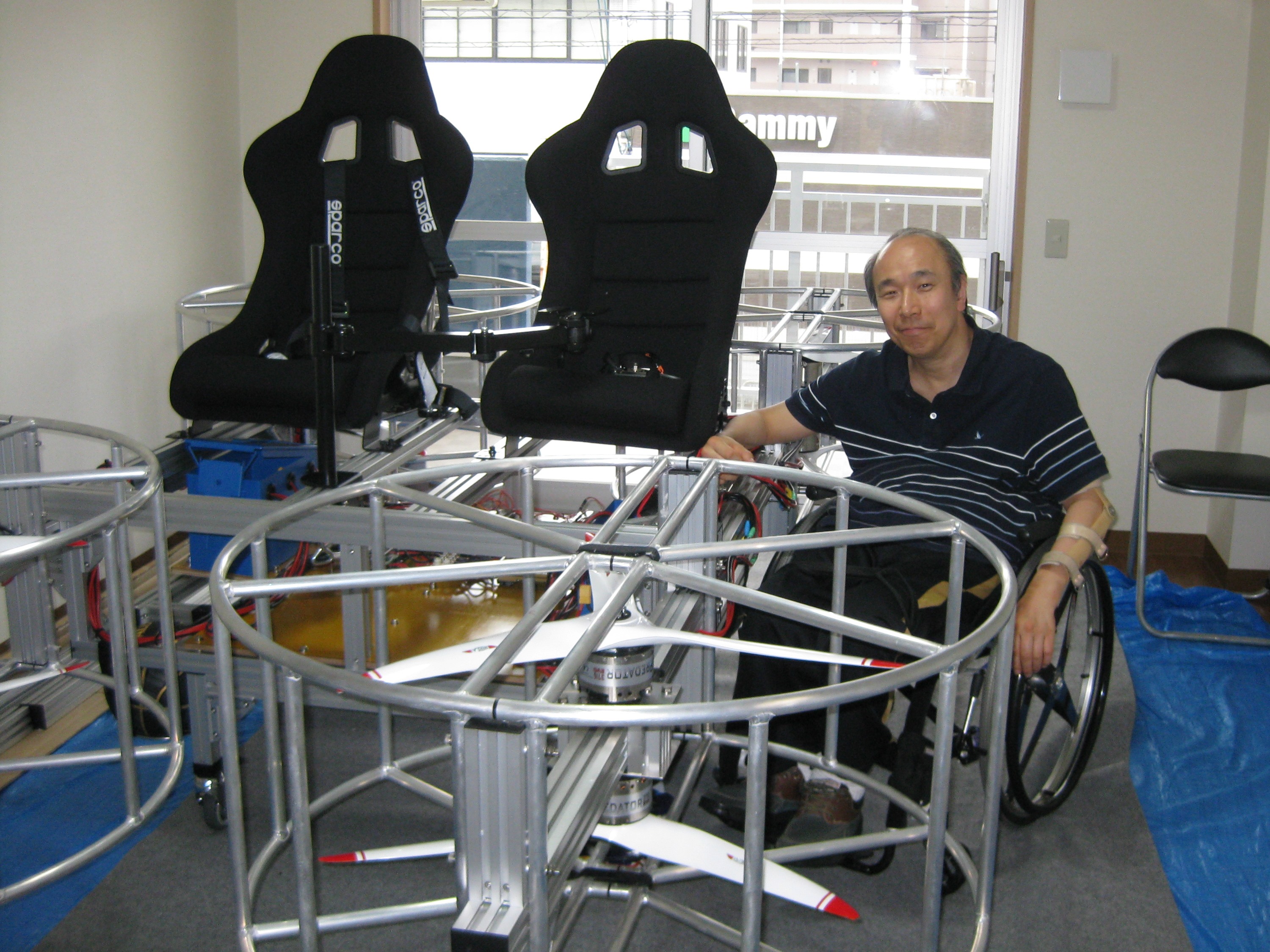 有人用大型マルチコプター Flying Chair 障害者でも自分の操縦で空を飛んで目的地に移動できる究極のバリアフリーな移動手段を目指して製作しました。 |