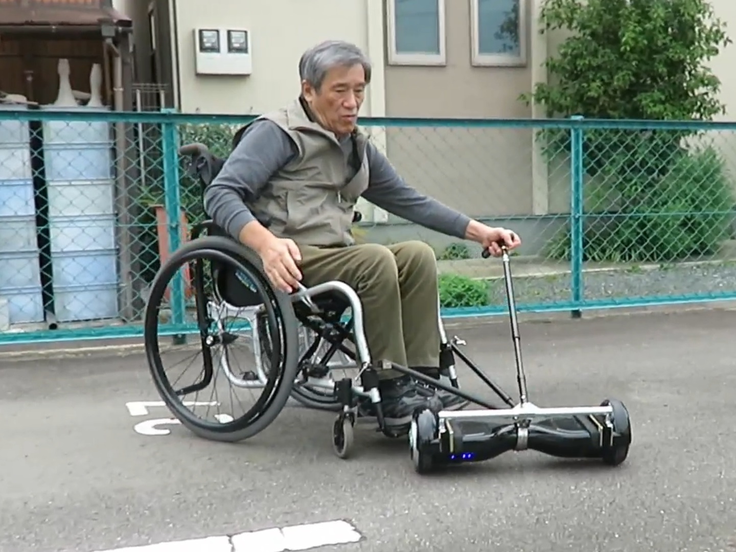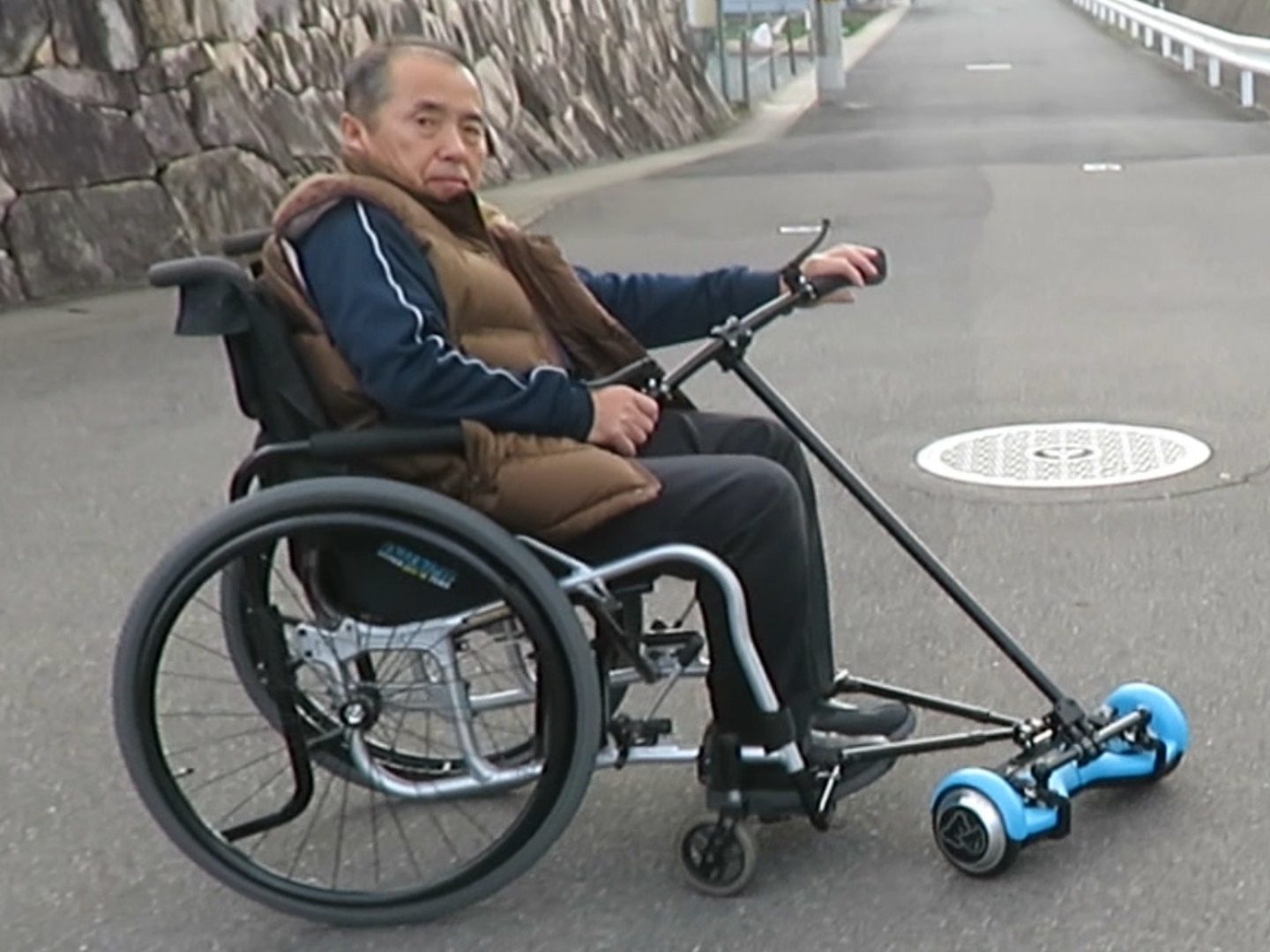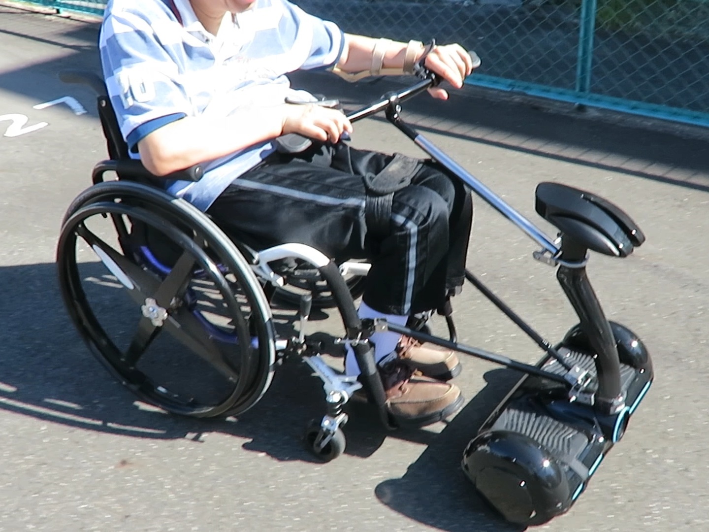 手動車いすを電動車いすにするための、バランススクーターを使った低価格の車いす電動化ユニットです。介助の方が楽になるよ う、電動で動かすタイプもあります。 |