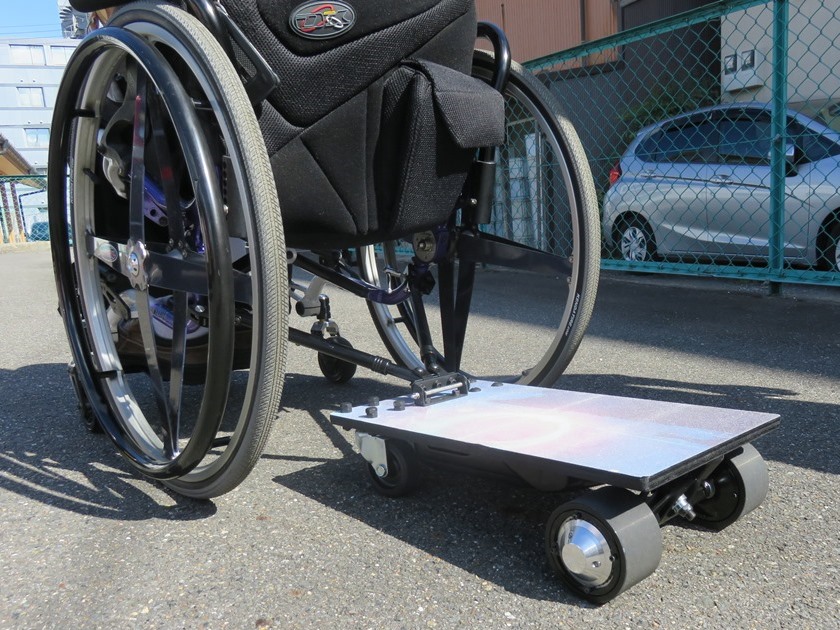 介助者操作型電動化ユニット(電動スケボータイプ) 電動スケボーが手動車いすを後から押すようにした電動化ユニットです。 |